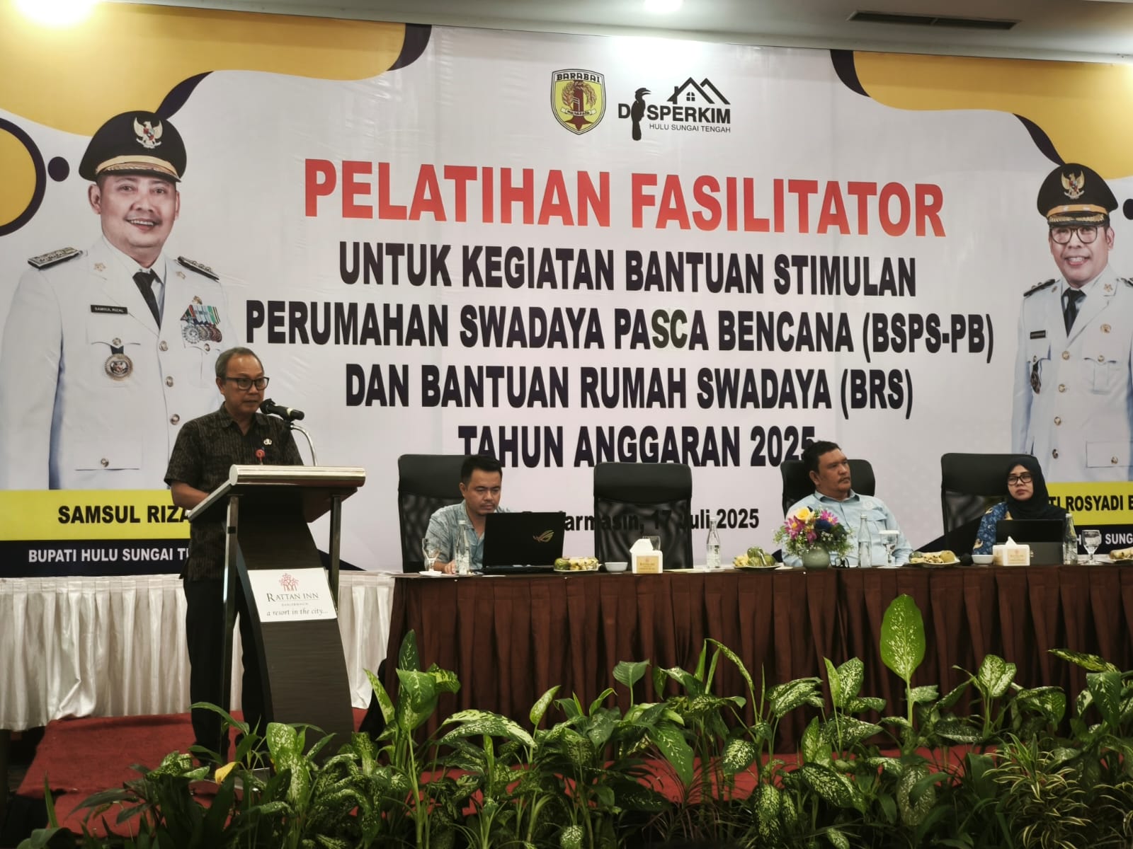 MEGAPOLIS.ID, BARABAI – Pemerintah Kabupaten Hulu Sungai Tengah (HST) melalui Dinas Perumahan Rakyat dan Kawasan Permukiman (Perkim) menggelar Pelatihan Fasilitator untuk Kegiatan Bantuan Stimulan Perumahan Swadaya Pasca Bencana (BSPS-PB) dan Bantuan Rumah Swadaya (BRS) Tahun Anggaran 2025, Kamis (17/7/2025), bertempat di Calamus Hotel Rattan Inn, Banjarmasin, Kalimantan Selatan.