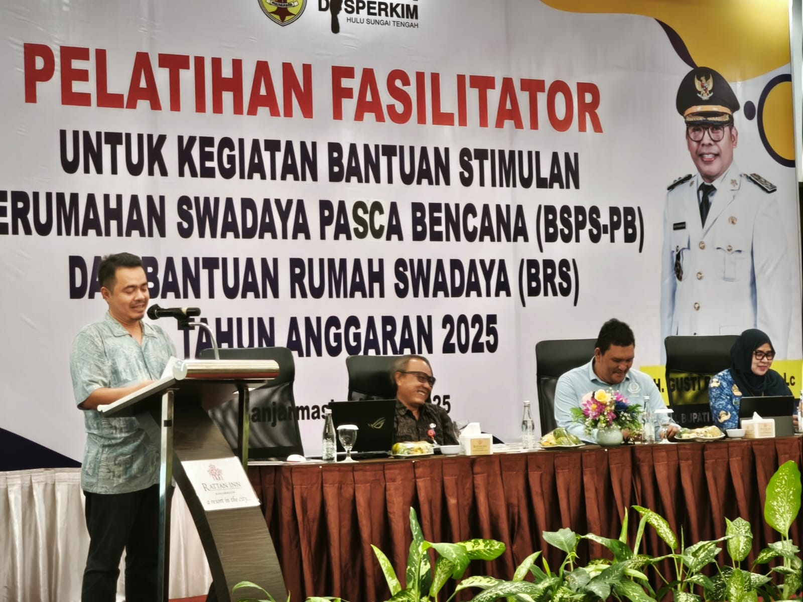 MEGAPOLIS.ID, BARABAI – Pemerintah Kabupaten Hulu Sungai Tengah (HST) melalui Dinas Perumahan Rakyat dan Kawasan Permukiman (Perkim) menggelar Pelatihan Fasilitator untuk Kegiatan Bantuan Stimulan Perumahan Swadaya Pasca Bencana (BSPS-PB) dan Bantuan Rumah Swadaya (BRS) Tahun Anggaran 2025, Kamis (17/7/2025), bertempat di Calamus Hotel Rattan Inn, Banjarmasin, Kalimantan Selatan.