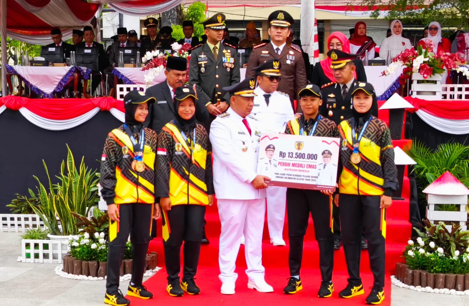 Bupati HST Samsul Rizal bertindak sebagai inspektur upacara. Dengan mengenakan pakaian dinas upacara berwarna putih, ia memimpin jalannya prosesi dengan penuh khidmat.