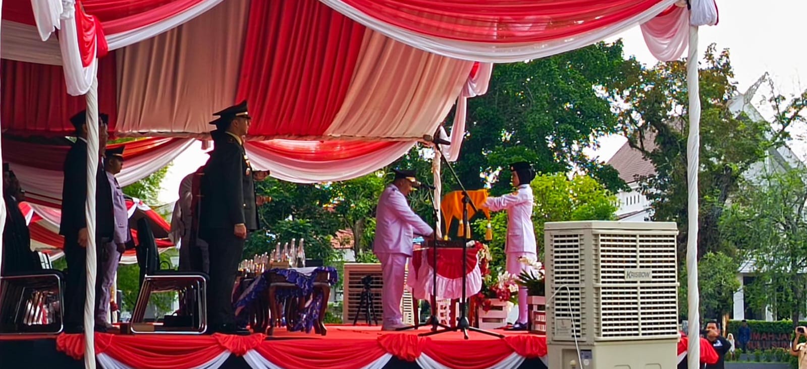Upacara dihadiri unsur Forum Koordinasi Pimpinan Daerah (Forkopimda), pejabat pemerintah, organisasi wanita, serta tokoh masyarakat. Tampak para undangan kompak mengenakan busana bernuansa merah dan putih, menambah semarak suasana peringatan hari kemerdekaan.
