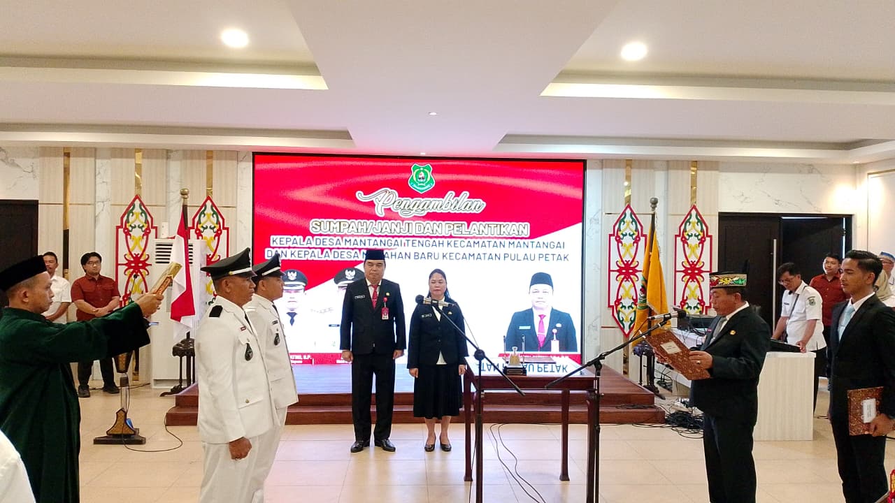MEGAPOLIS.ID, KUALA KAPUAS – Bupati Kapuas H. Muhammad Wiyatno melantik dua Kepala Desa terpilih, yakni Kepala Desa Mantangai Tengah Ahmadi, Kecamatan Mantangai, dan Kepala Desa Narahan Baru, Fadli, Kecamatan Pulau Petak. Prosesi pelantikan berlangsung di Aula Kantor Bupati Kapuas, disaksikan Setda Kapuas.Usis l Sangkai dan jajaran Forkopimda, para camat, tokoh masyarakat, serta keluarga para kepala desa, Rabu (8/10/2025).