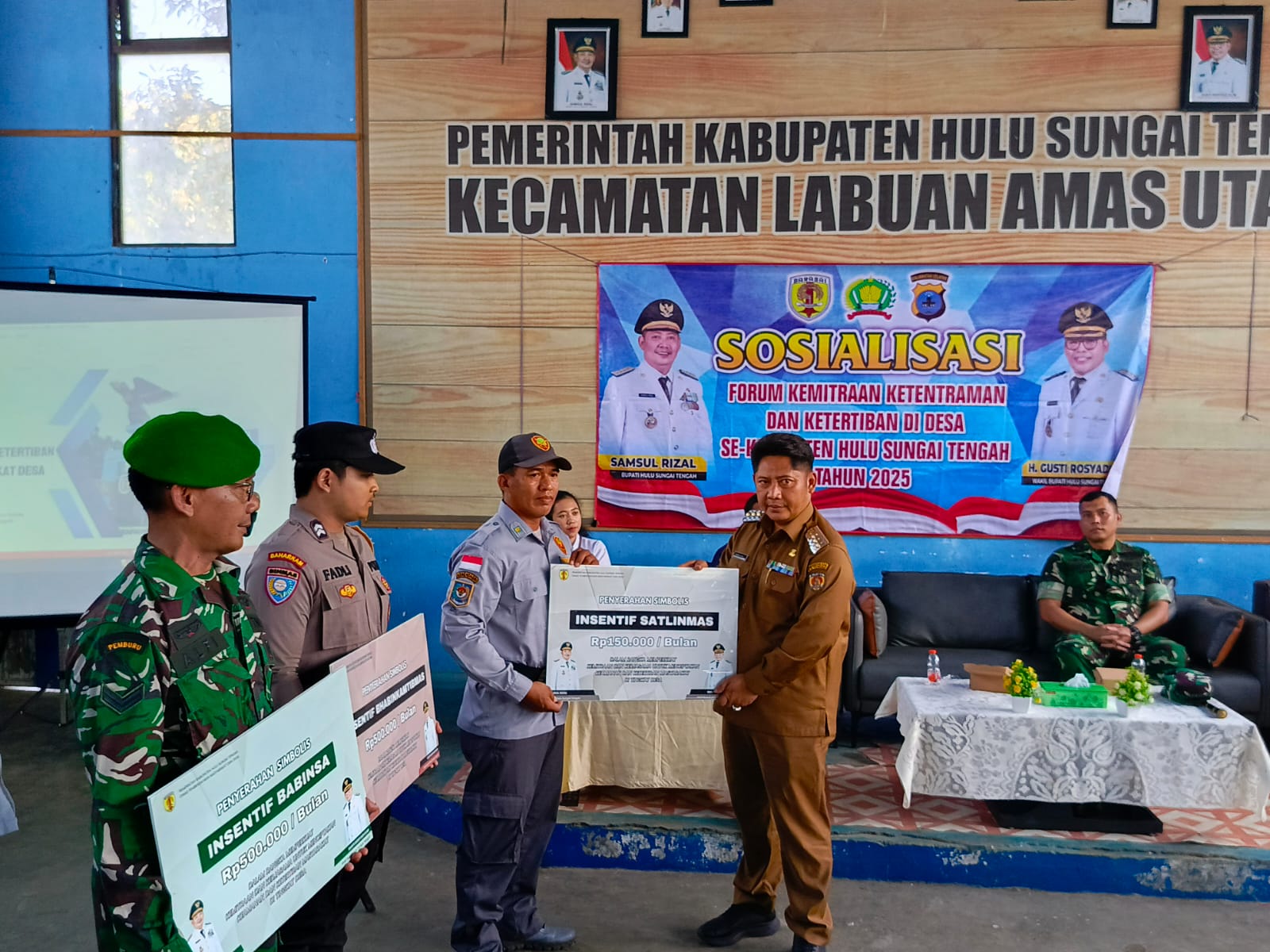 Sebagai bentuk dukungan Pemerintah Daerah, Bupati HST juga menyampaikan bahwa melalui Peraturan Bupati Nomor 21 Tahun 2025 tentang Pedoman Penyusunan APBDes, telah diatur pemberian insentif bagi Babinsa dan Bhabinkamtibmas sebesar Rp500.000 per desa, serta insentif bagi Satlinmas sebesar Rp150.000 per bulan, yang dialokasikan melalui APBDes masing-masing desa.