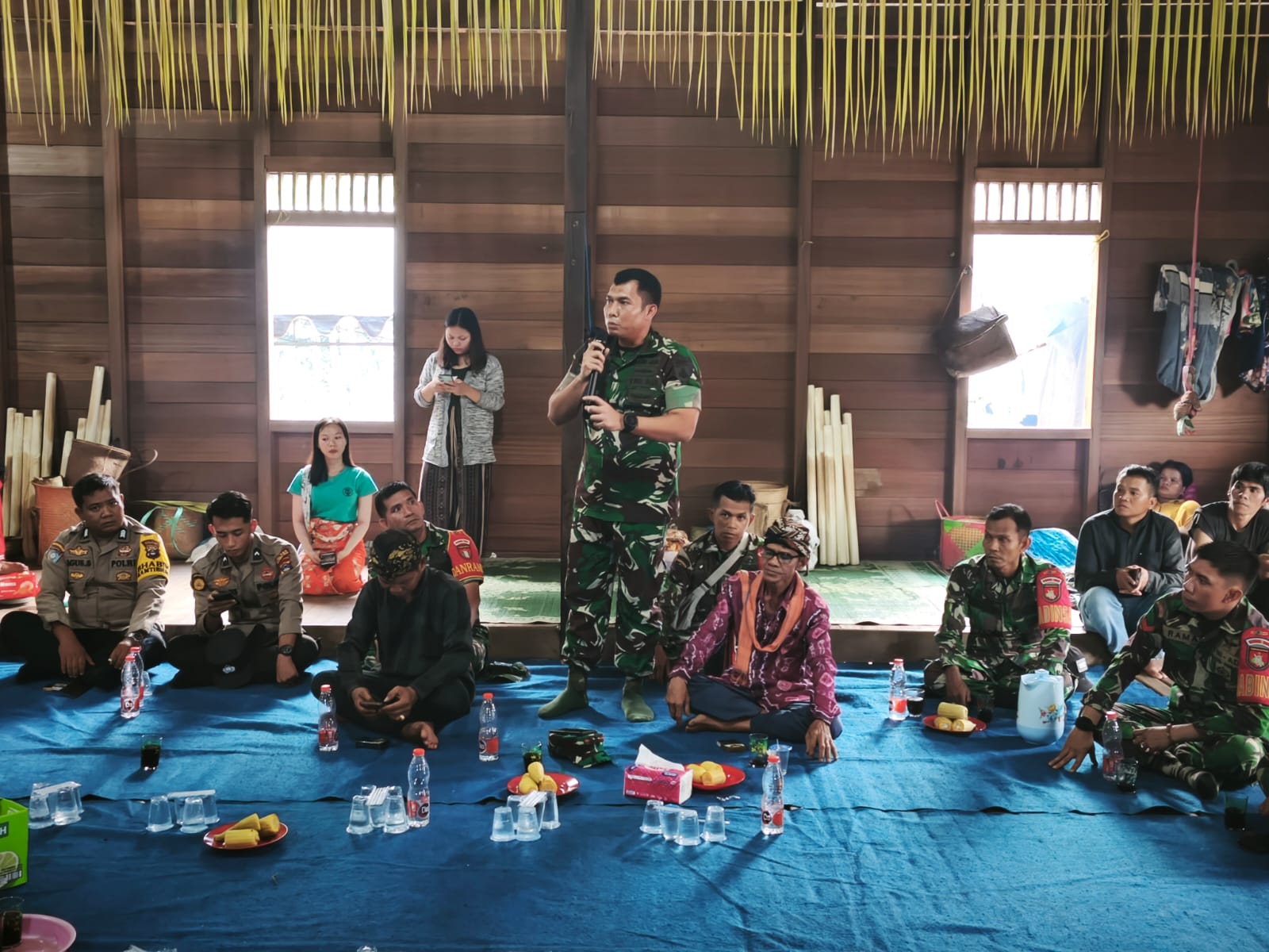 Kehadiran Dandim disambut hangat oleh masyarakat adat dengan tarian selamat datang dan pengalungan bunga oleh Ketua Balai Adat Kiyu, Makurban. Setelah prosesi penyambutan, Dandim memasuki Balai Adat Kiyu untuk mengikuti rangkaian acara secara langsung.