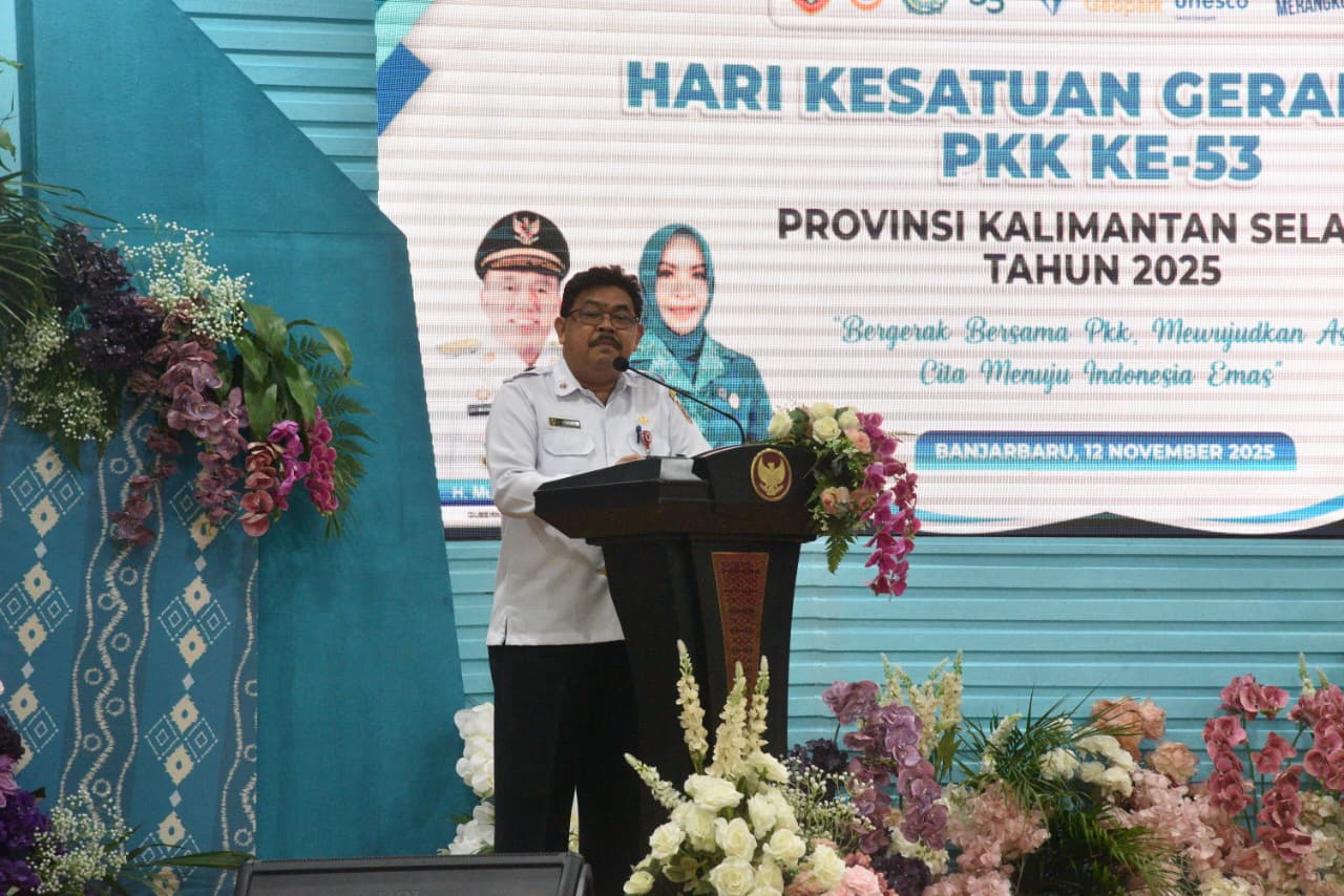 MEGAPOLIS.ID, BANJARBARU — Gubernur Kalsel H Muhidin melalui Plt Asisten Pemerintahan dan Kesejahteraan Rakyat Setdaprov Kalsel Dr HM Muslim, hadiri Peringatan Hari Kesatuan Gerak (HKG) PKK ke-53 Tingkat Provinsi Kalsel yang dirangkai dengan Rapat Kerja Daerah (Rakerda) PKK se-Kalsel, di Gedung DR KH Idham Chalid, Banjarbaru, Rabu (12/11/2025).